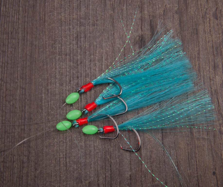 Dieses Makrelenvorfach ist mit vier Circle Hooks, Fluolockperlen und blauen Federn ausgestattet.
