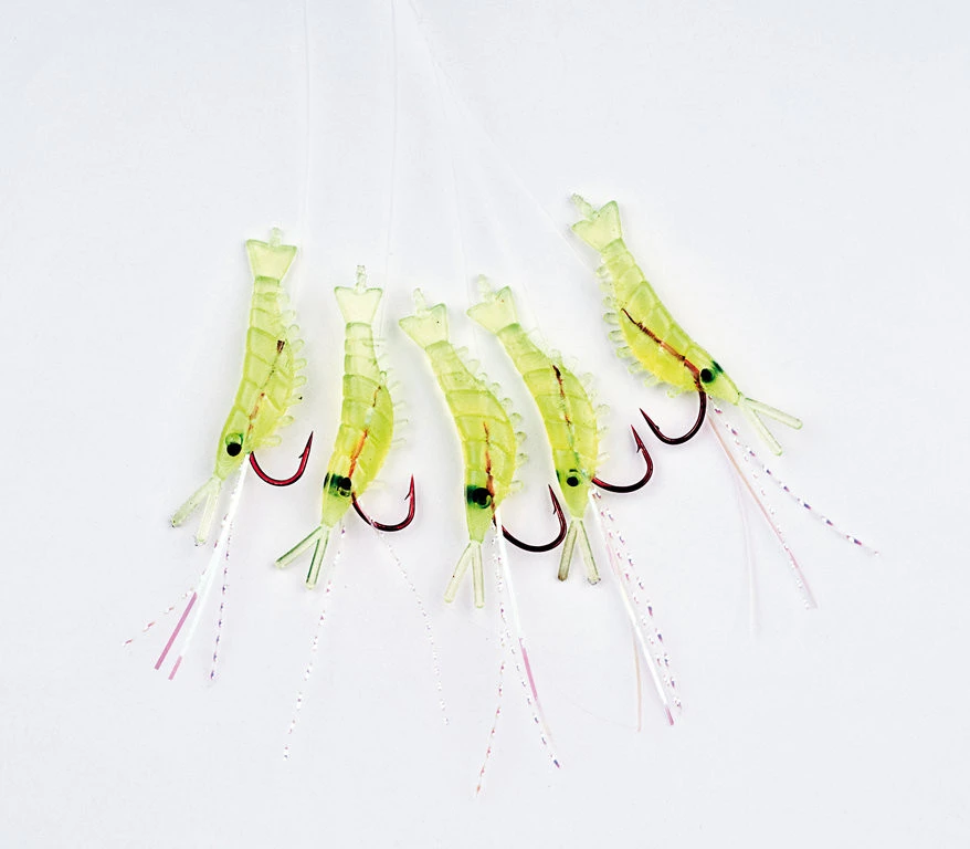 Dieses Shrimpvorfach besteht aus fünf kleinen Shrimps in der Farbe chartreuse. Befestigt sind diese an einem Haken der Größe 4. Die Vorfachlänge beträgt 150cm. Der Durchmesser der Hauptschnur ist 0,40mm und der des Vorfachs 0,30mm.