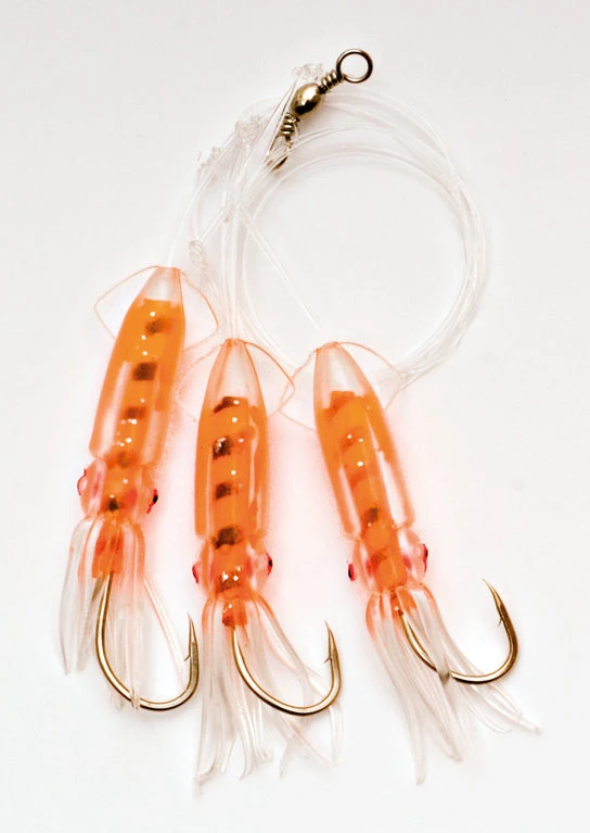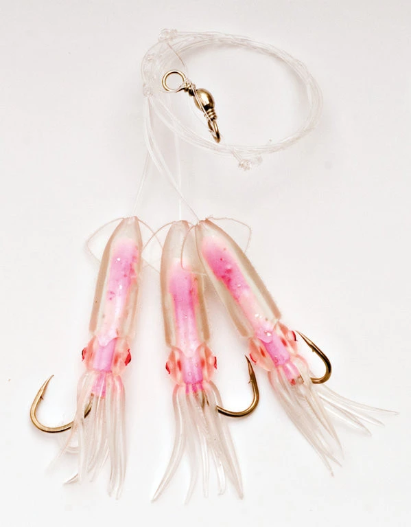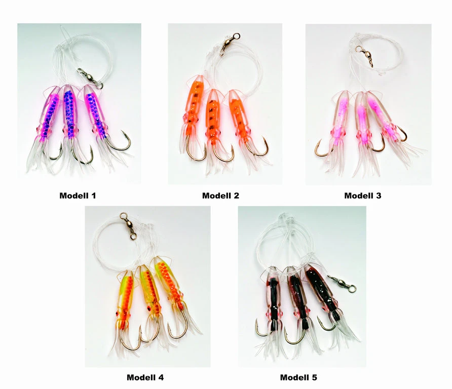 Dieses Vorfach besteht aus 0,70mm starker Schnur mit einer Länge von 150cm. An ihr sind drei Flügel-Octopusse befestigt. Es gibt dieses Vorfach in fünf verschiedenen Farben. Die Haken an denen die Octopusse montiert sind haben die Größe 6/0.