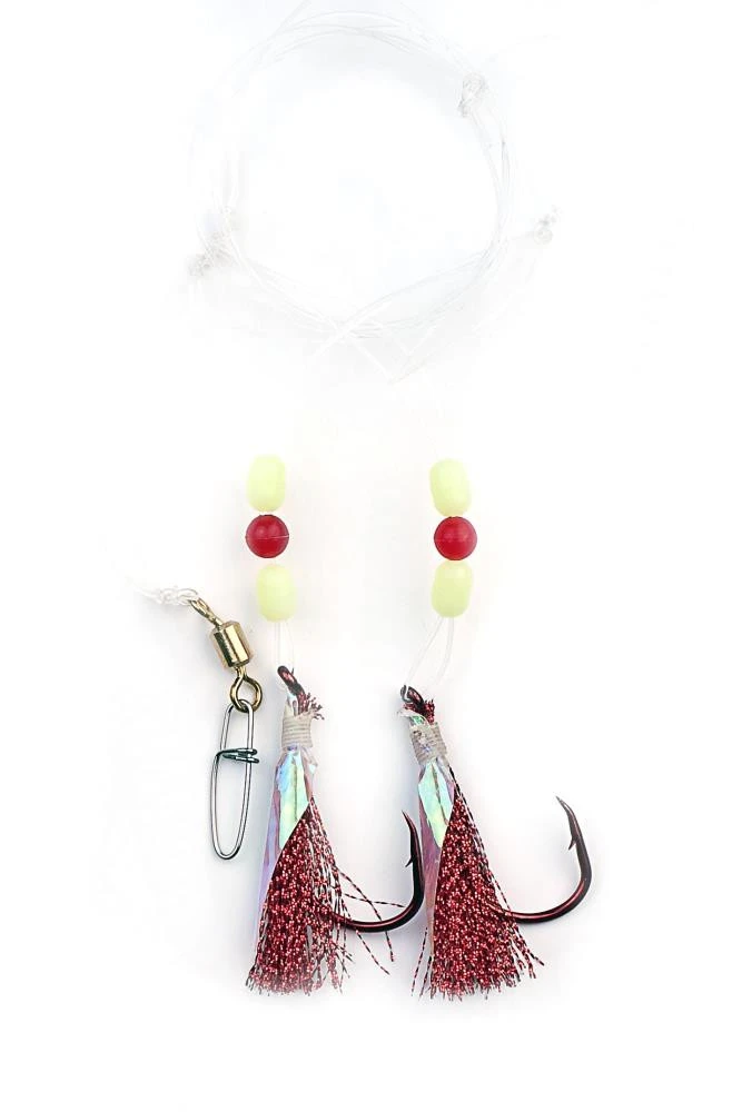 Diese Dorschvorfächer gibt es in zwei verschiedenen Farben. Diese Dorschfliegen haben einen Haken der Größe 5/0 und sind an einer 1,15m langen und 0,80mm starken monofilen Schnur gebunden.
