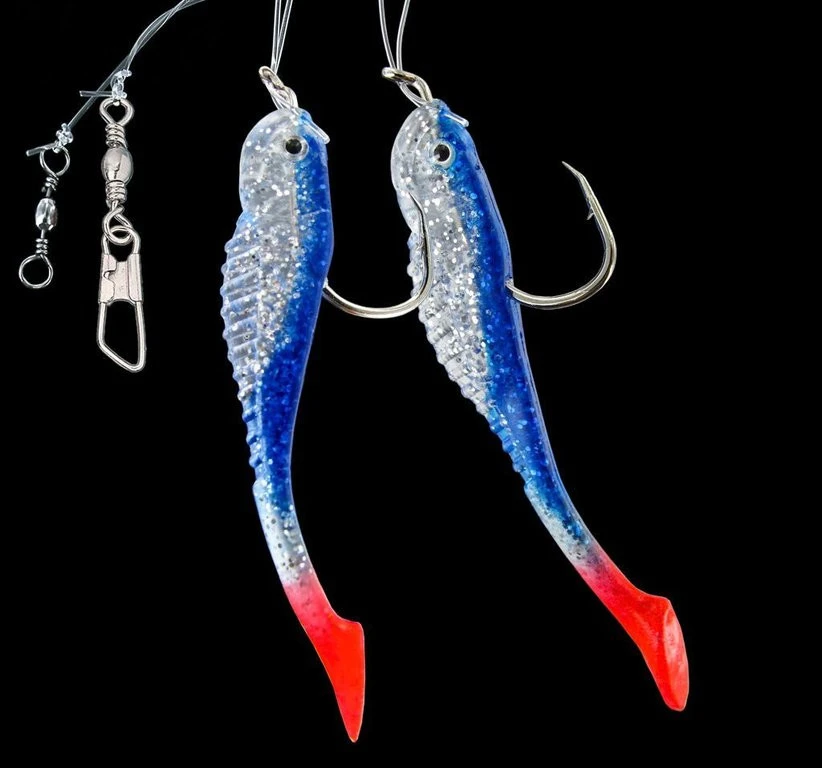 Dieses Vorfach besteht aus zwei soften Gummifischen mit Paddelschwanz und inneliegender Reflexfolie. Die Fische sind an 0,60mm starker monofiler Schnur und Haken der Größe 4/0 befestigt.