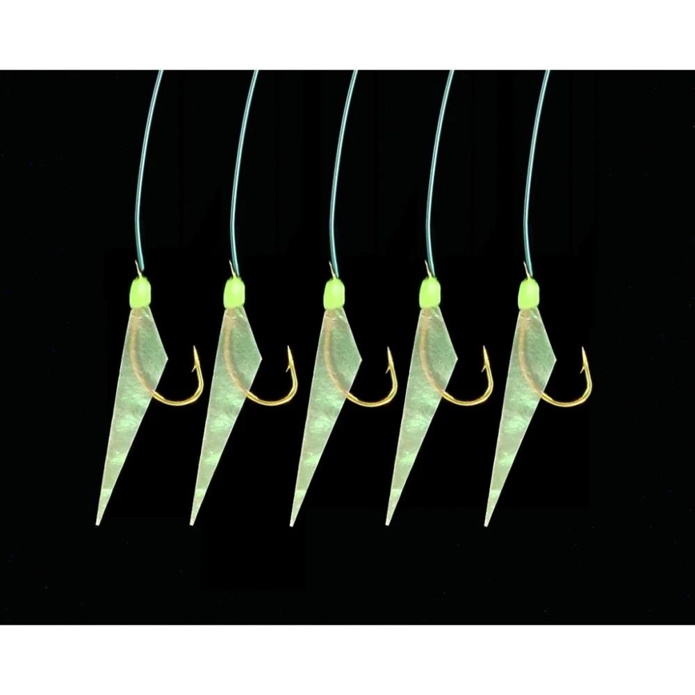 Dieses Heringsvorfach besteht aus 5 Seitenarmen mit Haken der Größe 7 oder 12, die mit echter Fischhaut versehen sind. Die Schnur hat eine Stärke 0,35/0,30mm.