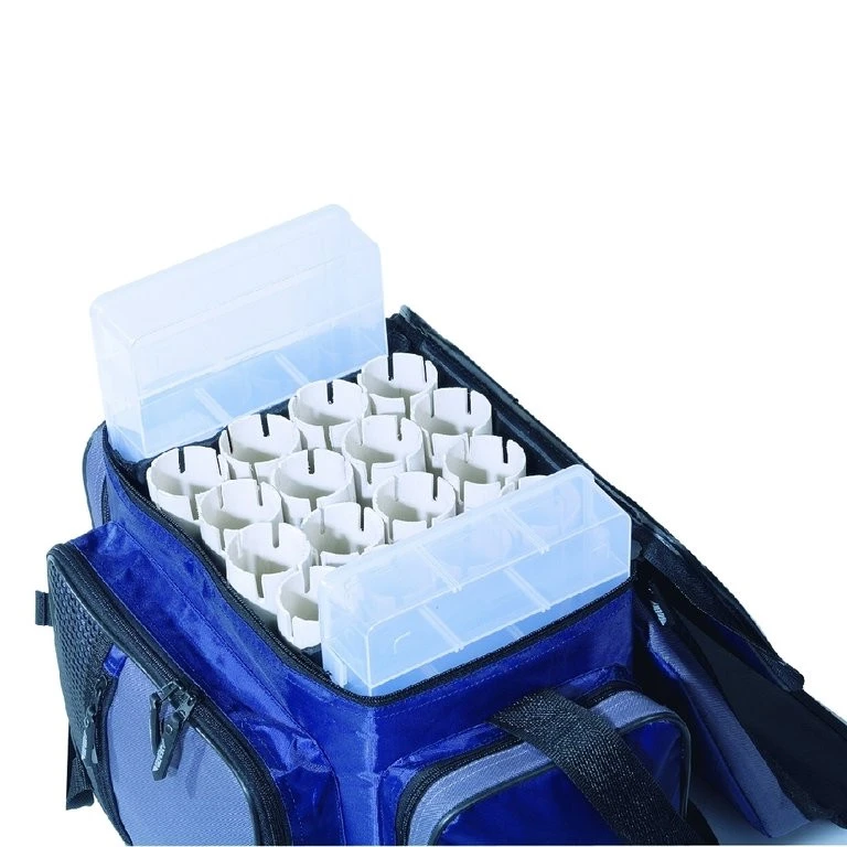 Die Tasche für die großen Bleifische! Sie hat im Inneren 16 Rohre mit Aussparungen für die Haken – also viel Platz für Pilker bis 25 cm Länge! Jedes einzelne Rohr kann dabei bis zu drei Pilker aufnehmen, also insgesamt 48! Zusätzlich befinden sich noch zwei große Kunststoff-Boxen im Innern. Reichlich Platz für Zubehör gibt`s in drei großen Taschen an den Seiten und vorn. Das Plus dieser Tasche ist das extra wasserabweisendes Material, welches schnell und sauber abspülbar ist. Sie ist damit perfekt für den Meereseinsatz. Sie verfügt über einen übergreifenden `Top-Deckel`, somit sind die Pilker gegen Spritzwasser geschützt. Die Tasche hat einen superstabilen Polstertragegriff und Schultergurt.