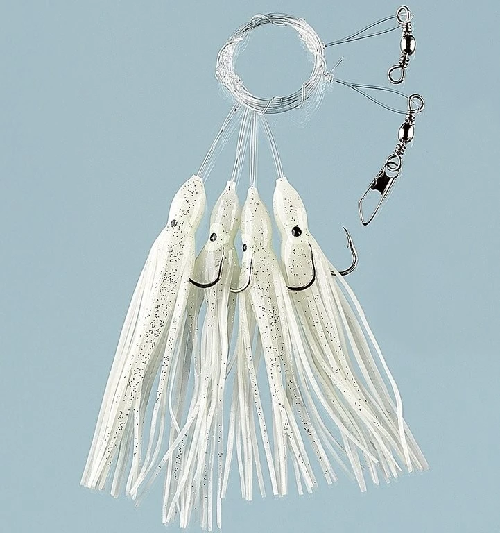 Dieses Vorfach besteht aus 4 fluo-farbenen Octopussen, welche an einer 0,60mm starken monofilen Schnur befestig sind. Die Haken, auf welche die Octopusse montiert sind, haben die Größe 4/0.