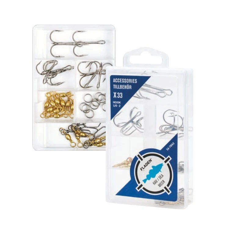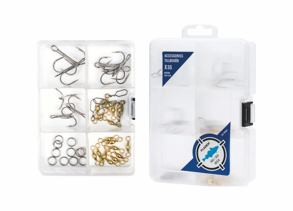 Diesen Artikel gibt es in zwei unterschiedlichen Größen-Ausführungen. Gefüllt sind die Boxen mit Angelzubehör für das Meeresangeln. Die kleinere Variante ist mit Drillingen der Größe 2 – 1/0 bestückt und die Größere mit Drillingen der Größen 2/0 – 5/0. Die kleine Box ist 33-teilig, während die große Box 35-teilig ist.