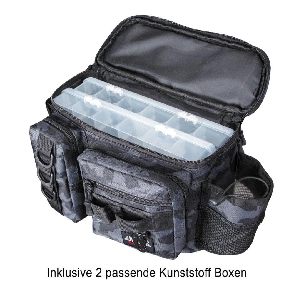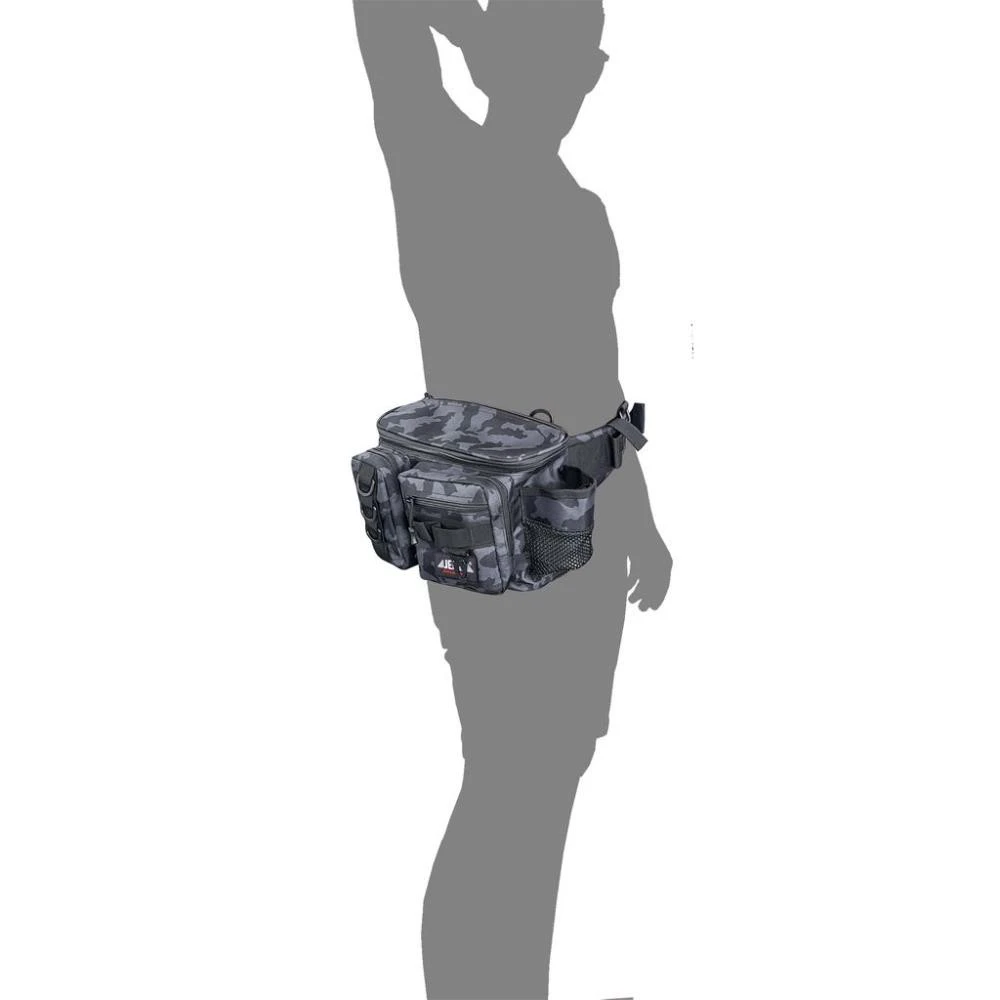 Diese Camou Hip Bag (Bauchtasche) verfügt insgesamt über 5 Reißverschlussfächer. Im oberen Hauptfach bietet die Bauchtasche genügend Platz für zwei große Plastikboxen, welche im Lieferumfang enthalten sind. Seitlich befindet sich eine Getränketasche sowie eine Halterung zum Transport einer montierten Rute sowie einer Zange. Zusätzlich wurden mehrere Clips und Karabiner zur Befestigung von weiterem Zubehör angebracht. Das Material ist wasserabweisend und sehr strapazierfähig.