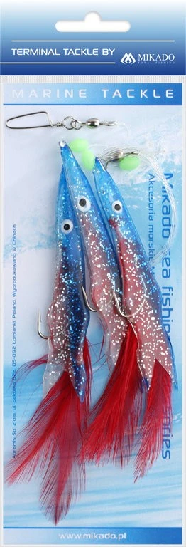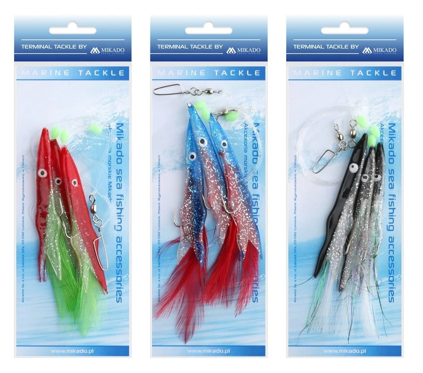 Dieses Vorfach ist ideal für die Angelei auf Dorsch und Seelachs. Es gibt drei verschiedene Farben. Die Gummifischimitate sind mit bunten Federn geschmückt und Haken der Größe 1/0 montiert.