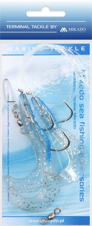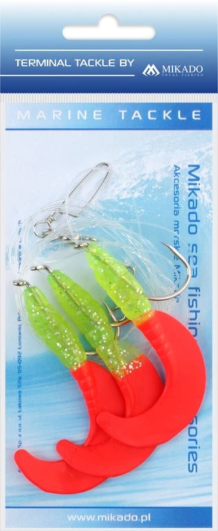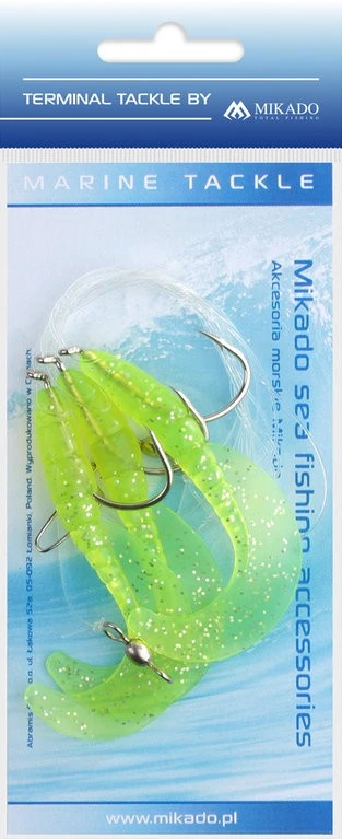 Rig für das Dorschangeln in drei verschiedenen Farben mit jeweils drei Twistern, welche an Haken der Größe 4/0 montiert sind.