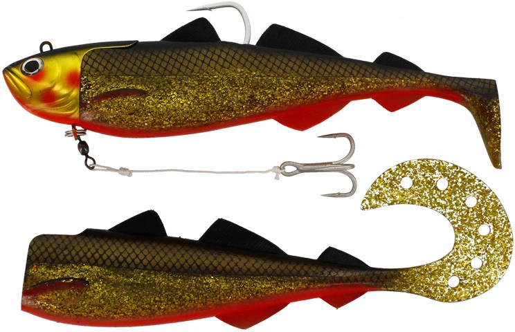Dieser Köder wird mit zwei verschiedenen Schwänzen und einem sehr starken Stinger-Haken-System ausgeliefert. Ein Körper hat einen Paddelschwanz, der viel Druck im Wasser erzeugt und einen verletzten und panischen Köderfisch immitiert. Der andere Body hat einen gedrehten Schwanz, der auch bei wenig Bewegung mit seinem glatten, wurmähnlichen Schwimverhalten für eine verführerische Aktion sorgt.