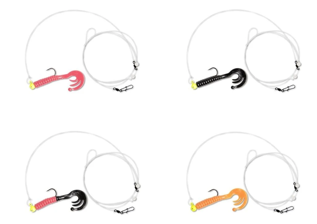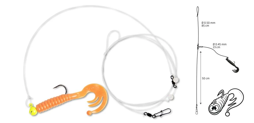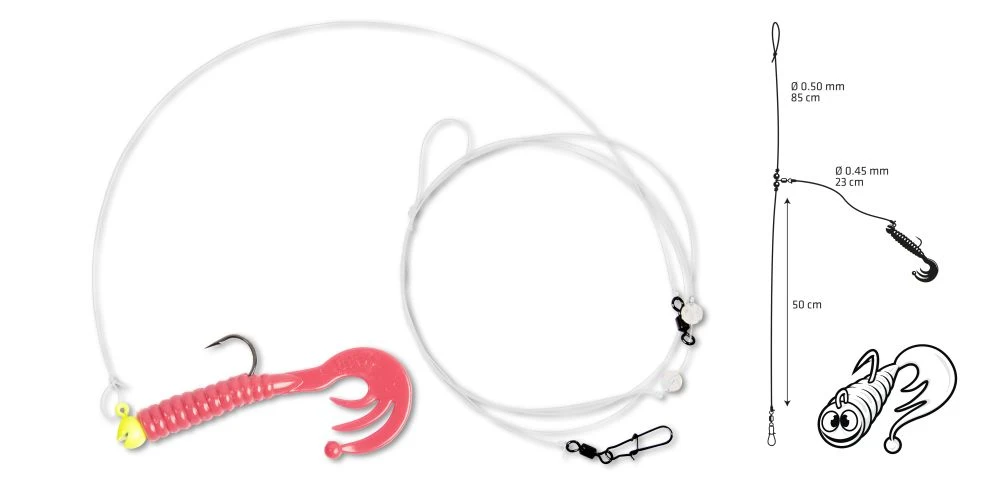 Dies ist ein Pilkvorfach mit Einzeltwister. Der Twister hat eine Länge von 7,5cm und ist an einem 3,5g schweren LOOky Jig Head befstigt. Es gibt vier verschiedene Farben. Die Schnurstärke ist 0,50mm und wird mit einer Tragkraft von 17kg angegeben. Der Abstand zwischen Bodenwirbel und dem 23cm langen Seitenarm beträgt 50cm. Der verwendete Jigkopf besitzt einen Haken der Größe 3/0.
